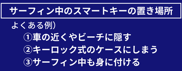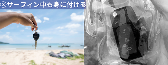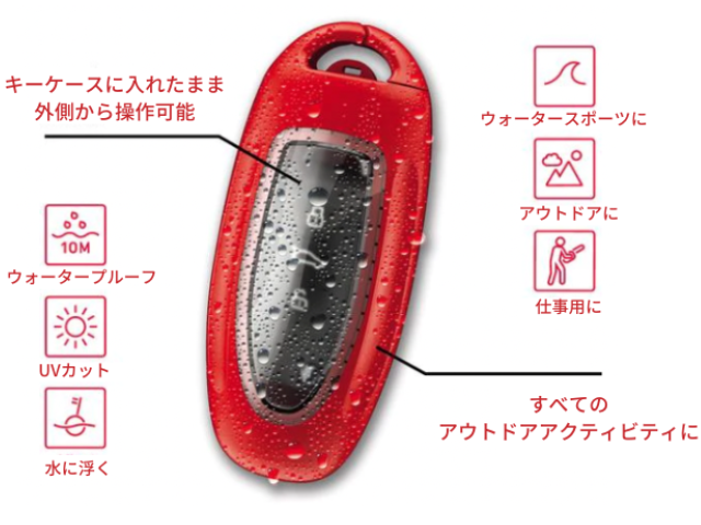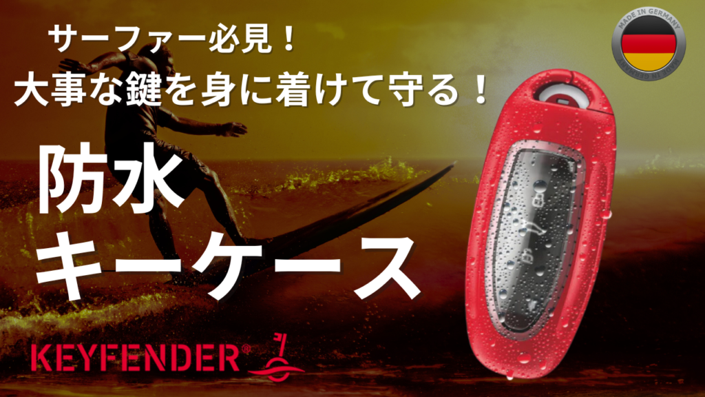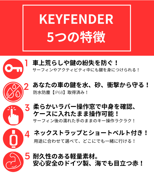 Makuakeプロジェクトページはこちら Makuakeプロジェクトページはこちらをクリック サーフィン中もあなたの愛車の鍵を身に着けて守る!KEYFENDER! スマートキーをそのまま車のタイヤの上や下に置いたり、車の近くに隠したり、タオルの中に入れてビーチに放置したりする人もいます。靴の中や下に隠す人もいるそうです。ただし、これは完全に安全な方法ではありませんので注意が必要です。タイヤの上などはすぐに見つけやすいですし、鍵を隠しているところを車上荒らしに見られていたら、サーフィンですぐには戻ってこないあなたの車はターゲットになってしまいます。砂浜に隠している人もたまにいるようですが、隠した場所がわからなくなるリスクも怖いです。 車に取り付けるキーボックスに鍵を保管するという方法もあります。サーファーの鍵の保管の仕方でもとても多いのがこの方法。鍵を安全に保管するための便利なツールですが、いくつかのデメリットも考慮する必要があります。鍵の収納方法としては、スマートキーの場合、電波を遮断する付属、もしくは別売りのアルミケースに入れてキーボックスにしまう必要があります。そうしないと「リレーアタック」の被害に合うリスクが高いからです。「リレーアタック」とは、スマートキーから出ている電波を特殊な受信機を使って車外で受信し、その電波を増幅させて車を外から開けてエンジンを始動し車を奪い去るという手法です。また「0000」など簡単な暗証番号にしていたり、不正なアクセスで開けられてしまったりで鍵の盗難リスクがあったり、バスコードを忘れてしまったり、キーセーフ本体を盗まれるという可能性もあります。パスコードを忘れた場合は本体を壊すしかない、と注意書きしているキーボックスもある通り、頑張れば無理やり開けることが出来るのがキーボックスです。 自分で身につけて海に入ることが出来れば、防犯対策としては一番安心です。とはいえただの鍵ではなく水に弱いスマートキーは防水対策が必須!ビニール袋やプラスチックのケースやバッグに入れて身につけて海に入ったけれど、激しい動きをした後に鍵を見てみたら水が隙間から入ってしまったという声もよく聞きます。またサーファーの皆さんもご存知の通り、海に行けば持っている荷物が海水や砂埃で砂だらけになりますよね。スマートキーも気がつけば砂だらけになってしまうことも多いのではないのでしょうか? KEYFENDER開発の際に、ドイツ国内外の様々なメーカーのスマートキーを集め、試行錯誤の末、皆さんが使えるキーケースのサイズを作り出しました。対応サイズを記載しておりますので、お持ちのスマートキーがKEYFENDERに対応しているか一度お確かめ下さいませ。 <対応サイズ>幅:39mm 長さ:95mm 高さ:25mm よりKEYFENDERがフィットするよう高さを調整出来る、3つの厚さの異なる粘着パットが付属しています。適したパッドを選択すると鍵が中でガタつくことがなくなり、快適にボタンを操作できるようになります。 KEYFENDERは大事な車の鍵を中に入れて身につけることが出来ます。鍵をタイヤの上に置いたり、砂の中に隠したり、ビーチに置いた袋の中に入れておいて盗まれてしまい、そのまま車自体も盗まれたり、車の中に置いておいた貴重品を盗まれたりするリスクを減らすことが出来ます。保険が効かずに新しいスマートキーを再度作り直すのもかなり費用がかかります。鍵が盗まれるだけれなく、自分でどこに置いたか分からなくなってしまってということも防ぐことが可能です。KEYFENDERがあれば、スマートキーを隠したり、持ち運びに不便でいつか漏れてしまうバッグ、キーを使用するために開ける必要がある大きくてかさばるキーロックセーフにお金をかけたりする必要はもうありません。 海に行くと身体も手も、持ってきた持ち物全てが砂まみれになりがち。スマートキーのボタンの隙間に砂が入って。。。という経験がある方もいらっしゃるのではないでしょうか。KEYFENDERにスマートキーを入れることで、ベトベトな海水だけでなく、砂や日焼け止めなどの油汚れからも鍵を守ることが出来ます。 KEYFENDERは衝撃に強いだけでなく、操作性も抜群です! 柔らかい透明の操作窓があるので、ケースに入れたまま中身を確認出来、またボタンを押すことが出来ます。サーフィンから戻ってきて車に戻るときに手を拭いたり洗ったりしなくてもすぐに鍵を開けることが出来てとても便利です。車に戻る度にしっかりしたケースから取り出して、また戻す、という作業がないのでとっても楽です! そのままでも、首にかけて、腕に付けて、持ち運ぶ! サーフィン時に鍵をなくしたりしないように、KEYFENDERには高品質のネオプレン製のネックストラップと調節可能なショートベルトが付属しているので、キーケースをいつでもどこでも持ち歩くことができます。そのまま持ち歩くのが難しい場面でも、ネックストラップとショートストラップを使用すると、キー